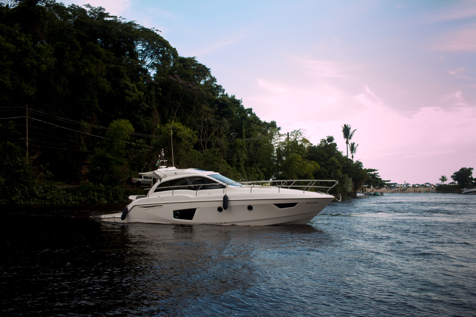 Entre os destaques estão a plataforma de popa submergível, hard top panorâmico com abertura elétrica e layout interno inteligente com dois camarotes e banheiro completo com box de ducha separado.
